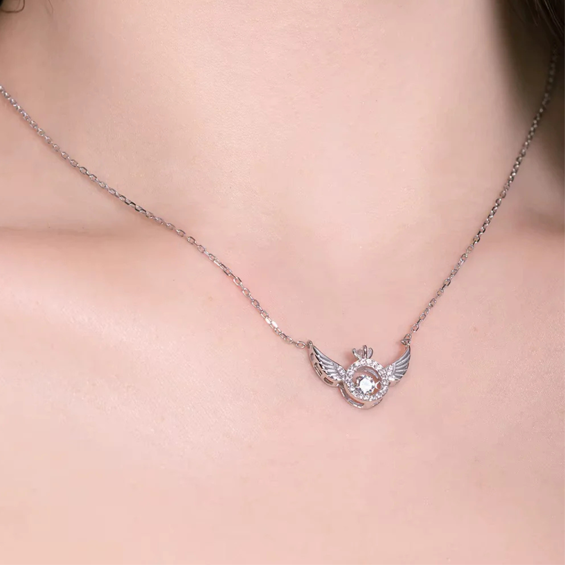 Lascia che la tua eleganza prenda il volo. La Collana Ali di cristallo raffigura il delicato ali d'angelo che avvolgono un brillante zircone centrale, simbolo di protezione e speranza. Perfetto per chi ama indossare gioielli che esprimono luce e libertà.