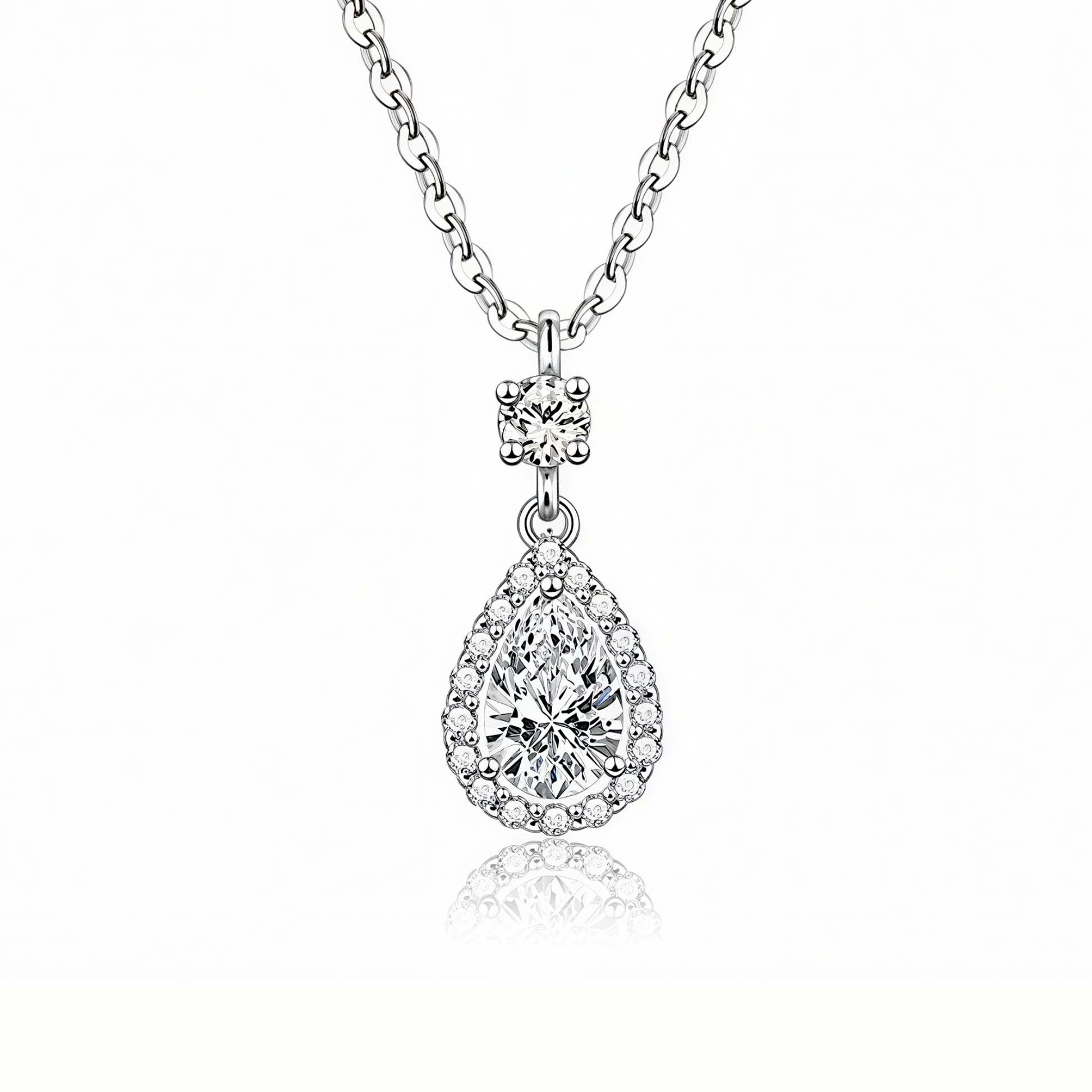 Il design presenta un delicato punto luce rotondo che precede un magnifico ciondolo a forma di goccia, finemente contornato da una corona di piccoli zirconi. Al centro, uno zircone taglio brillante più grande cattura ogni raggio di luce, replicando lo splendore di un diamante.