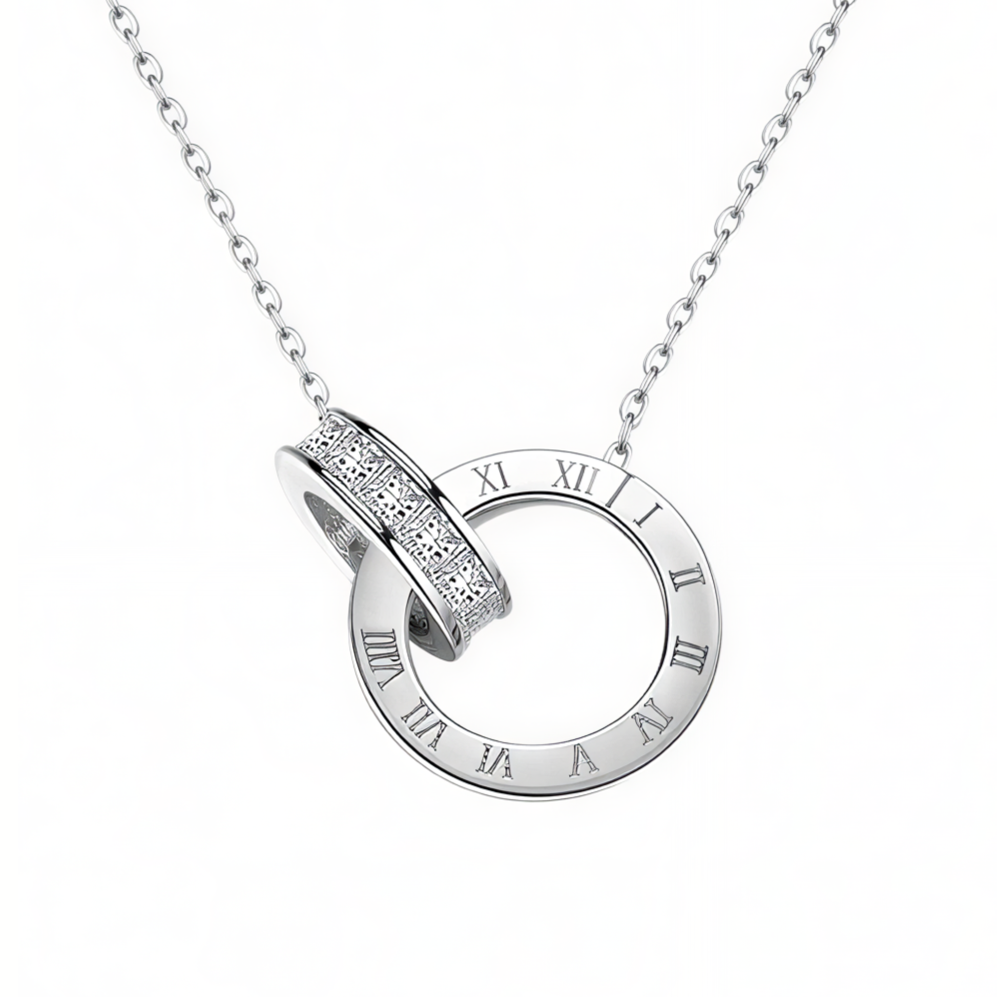 Il design presenta due anelli interconnessi, un simbolo potente di unità e inseparabilità. L'anello esterno è inciso con i classici Numeri Romani, un riferimento al tempo che scorre e all'eternità. L'anello interno, più piccolo e mobile, è finemente decorato con un pavé di zirconi bianchi, che aggiungono un tocco di lusso e luminosità.